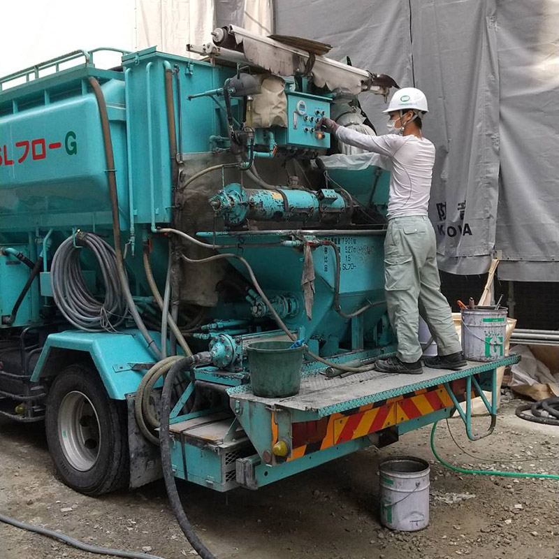 施工現場で必要量を現場で混練りしスラリー状で御提供するシステムです。